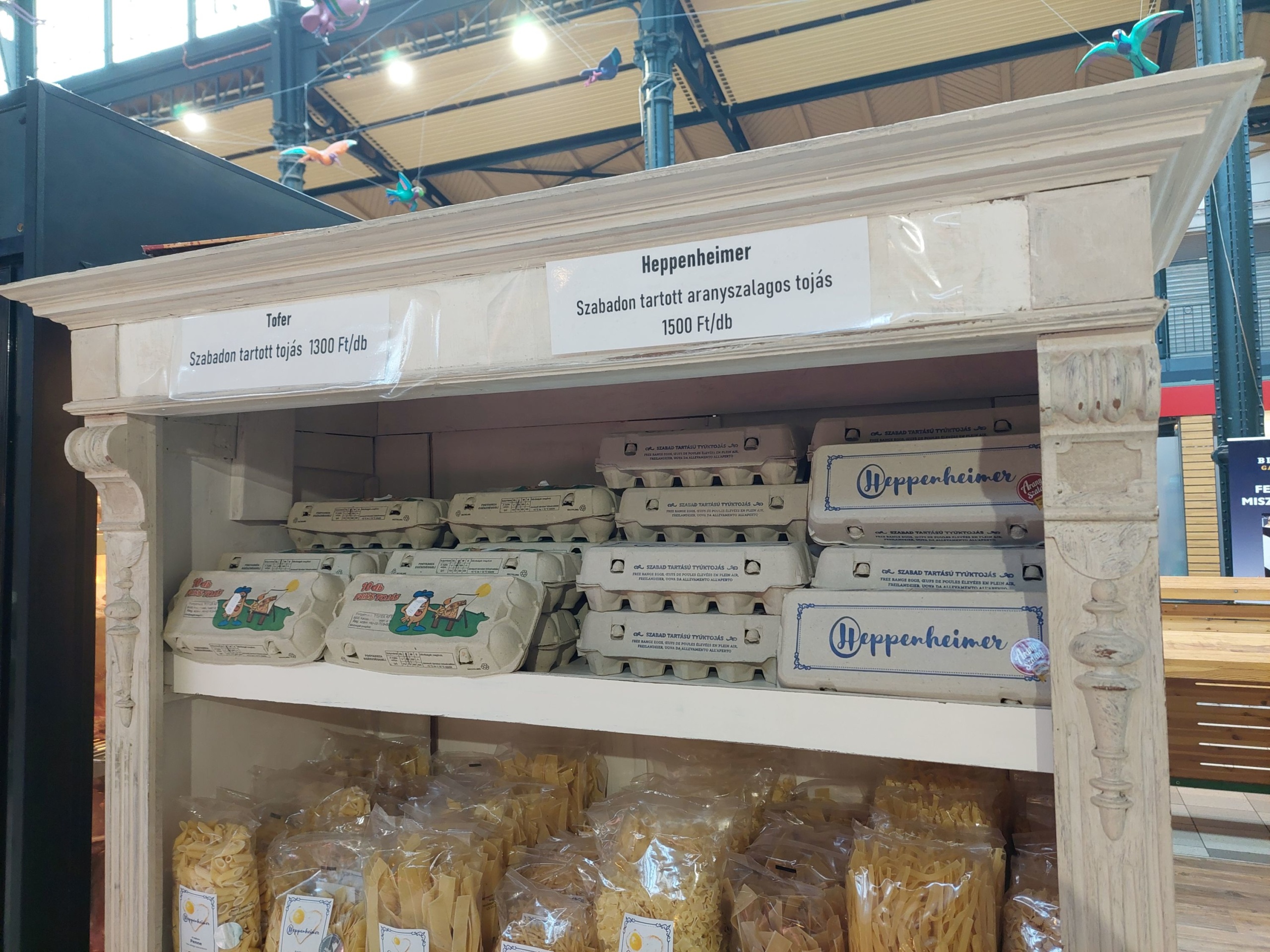 A Klauzál téri piacon napközben csupán néhány árus várja az elvétve megjelenő vendégeket. Hentest itt egyáltalán nem találunk, csupán házi tojásra lelünk: a sima 10 darabos kiszerelés 1300, az aranyszalagos 1500 forintba kerül. A Lehel piacon is hasonló tojásárakat találunk, ott