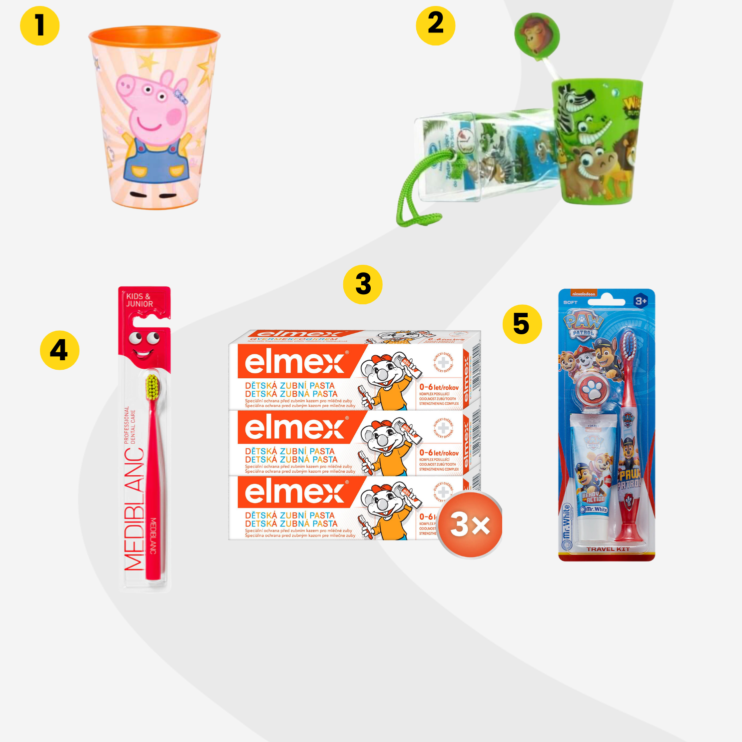 A kisgyermekek számára összeállított iskolai tisztasági csomag egyik alapdarabja lehet a kis méretű Peppa Pig pohár (1), amely nemcsak tökéletesen megfelel a napi fogmosáshoz, hanem vidám mintájával is örömet szerez a gyerekeknek. A fogmosás megkönnyítésére szolgál a fogmosó készlet (2), amely fogkefét és fogkrémet is tartalmaz, ráadásul praktikus csomagolása miatt könnyen elfér a tisztasági táskában.