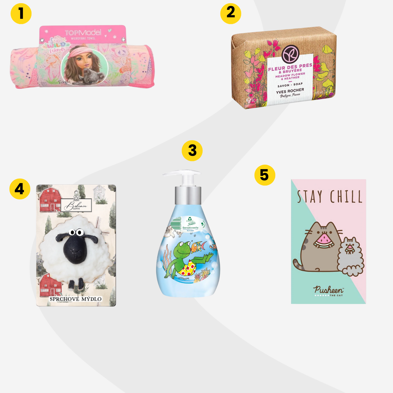 Az érzékeny bőrű gyerekek számára érdemes olyan terméket választani, mint a gyengéd, bőrbarát szappan (3), amelyet kifejezetten a legkisebbek igényeihez fejlesztettek ki. Ha egy különlegesebb, játékos formájú megoldásra vágysz, a kézműves glicerines szappan (4) jó választás lehet: kellemes illatú, természetes összetevőkkel készült, ráadásul cuki bárány formája garantáltan mosolyt csal az arcokra.