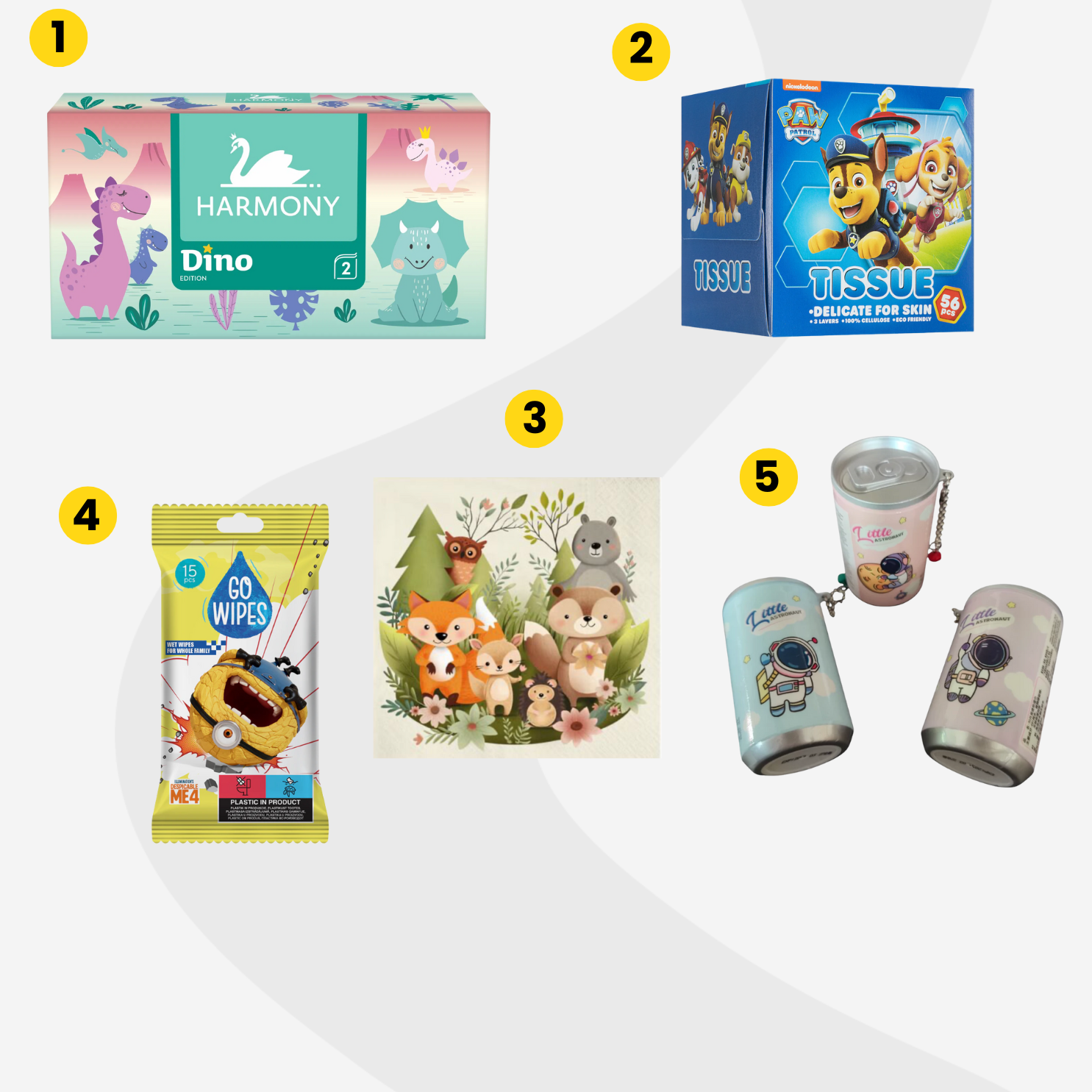 A mindennapokra praktikus kiegészítő lehet a szalvéta aranyos erdei állatkás mintával (3) is, amely 10 darabos kiszerelésben érkezik, így mindig van tartalék a kisebb balesetekhez. A tisztítás és frissítés még könnyebbé válik a Little Astronaut nedves törlőkendő (4) segítségével, amely kíméletes tisztítást biztosít, kis méretű csomagolásának köszönhetően pedig bárhová magunkkal vihetjük.