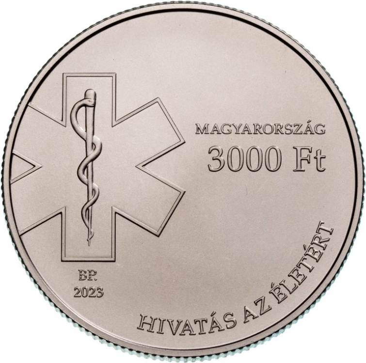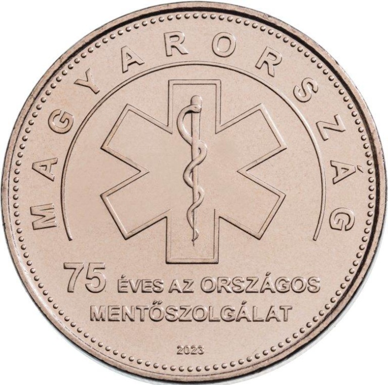 A központi motívum alatt a “75 éves az Országos Mentőszolgálat” felirat és a “2023” verési évszám olvasható. Az érme előlapjának szélén található gyöngysorszegélyen belül, körvonallal határolt felső köriratban a “Magyarország” felirat látható.