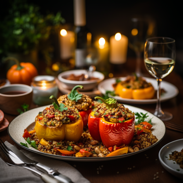 Sütőtökös quinoa töltött paprika a Midjourney képgenerátor segítségével (Prompt:”Stuffed peppers with pumpkin and quinoa on christmas table”)