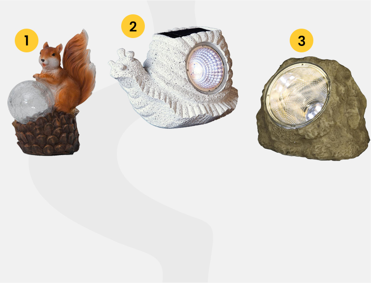 Lehet találni kis figurákat, mint például a mókusos vagy a csigás, de aki az egyszerűbb darabokat kedveli, annak tökéletes választás a kőre hasonlító fényforrás. Ezeket jól mutatnak a kerthez vezető út mentén, akár sziklakertben vagy kerti tó mellett. Bár egy-egy darab is elég belőlük, érdemes inkább több fajtából válogatni, mint egyből többet venni.