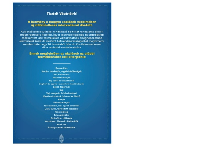 Péntek este jött ki a Magyar Közlönyben, hogy a kötelező akciókban érintett élelmiszerüzleteknek miként kell majd reklámozniuk a kormány által előírt árcsökkentéseket. A kereskedőknek a boltjuk minden bejáratánál ki kell tenni a kormányzati illetve az árstopos hirdetések hangulatát idéző plakátot, melyet itt be is mutatunk, íme.