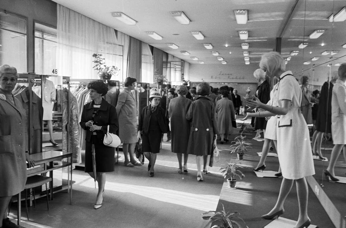 9.A hatvanas-hetvenes évek években élte virágkorát ez a Vörösmarty téri áruház. A kép hátsó részében a fal felirata ad némi segítséget (Fotó: Fortepan / ETH Zürich)