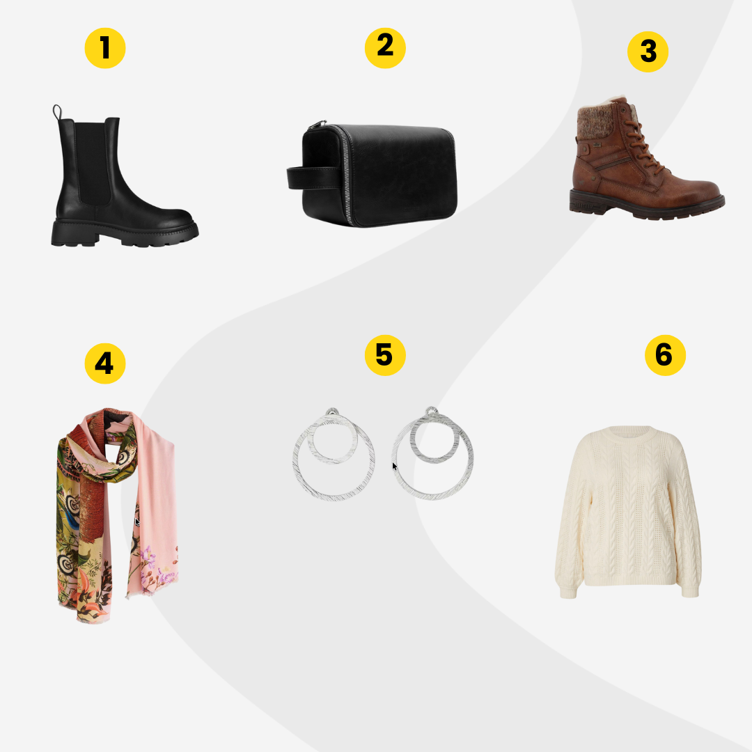 A Mustang Bienke női rövid szárú csizma (3) egy elegáns és sokoldalú barna csizma, amely téli outfitekhez is passzol — jól jön hidegebb hónapokra, és stílusos választás lehet. Ha már hideg: az ONLY Carmakoma Rubina (6) meleg, kényelmes, pihe-puha hófehér pulóver, amely átöleli viselőjét a hideg napokon — jó ajándék azoknak, akik értékelik a komfortot és a laza eleganciát. Ez a színes Desugael sál (4) pedig feldobhat egy egyszerű outfitet is — apró, de hatásos kiegészítő, ami a hétköznapokat is ünnepivé teheti. A Pull&Bear fekete piperetáskája (2) kompakt, praktikus kistáska, ami tökéletes a mindennapi használatra vagy kisebb holmik tárolására. A Pilgrim fülbevaló (5) elegáns, finom darab, ami bármilyen outfitet kiegészít és ünnepi hangulatot adnak a megjelenésnek.