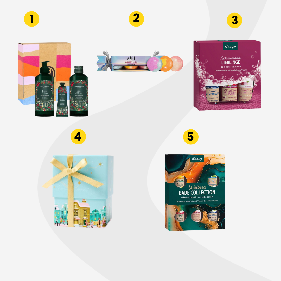 Az Yves Rocher Fürdőcsomag (1) ünnepi hangulatot idéző, vaníliás-virágos illattal megálmodott testápoló, kézkrém és tusfürdő csomag — ideális azoknak, akik otthoni wellnessre, pihenésre vágynak. Ezek a vidám, színes fürdőgolyók (2) segítenek bársonyos bőrt varázsolni az ajándékozottunknak. A Kneipp Happy Bathing ajándékszett fürdőbe (3) egy három habfürdőt tartalmazó szett, amely hidratálja és táplálja a bőrt — remek ajándék azoknak, akik szeretnek jót lazítani egy forró fürdővel. Ez a fürdőolaj készlet (5) öt kis üvegcsét rejt: mindegyik 1-2 kádnyi, hatékony természetes kivonatokkal és esszenciális olajokkal dúsított fürdőre elegendő. A Winter Wonder fürdőszett (4) pedig egy zuhanyzselét, testpermetet és kézkrémet, valamint 2 fürdőpezsgőt rejtő luxus ajándékkészlet a valódi törődés jegyében.