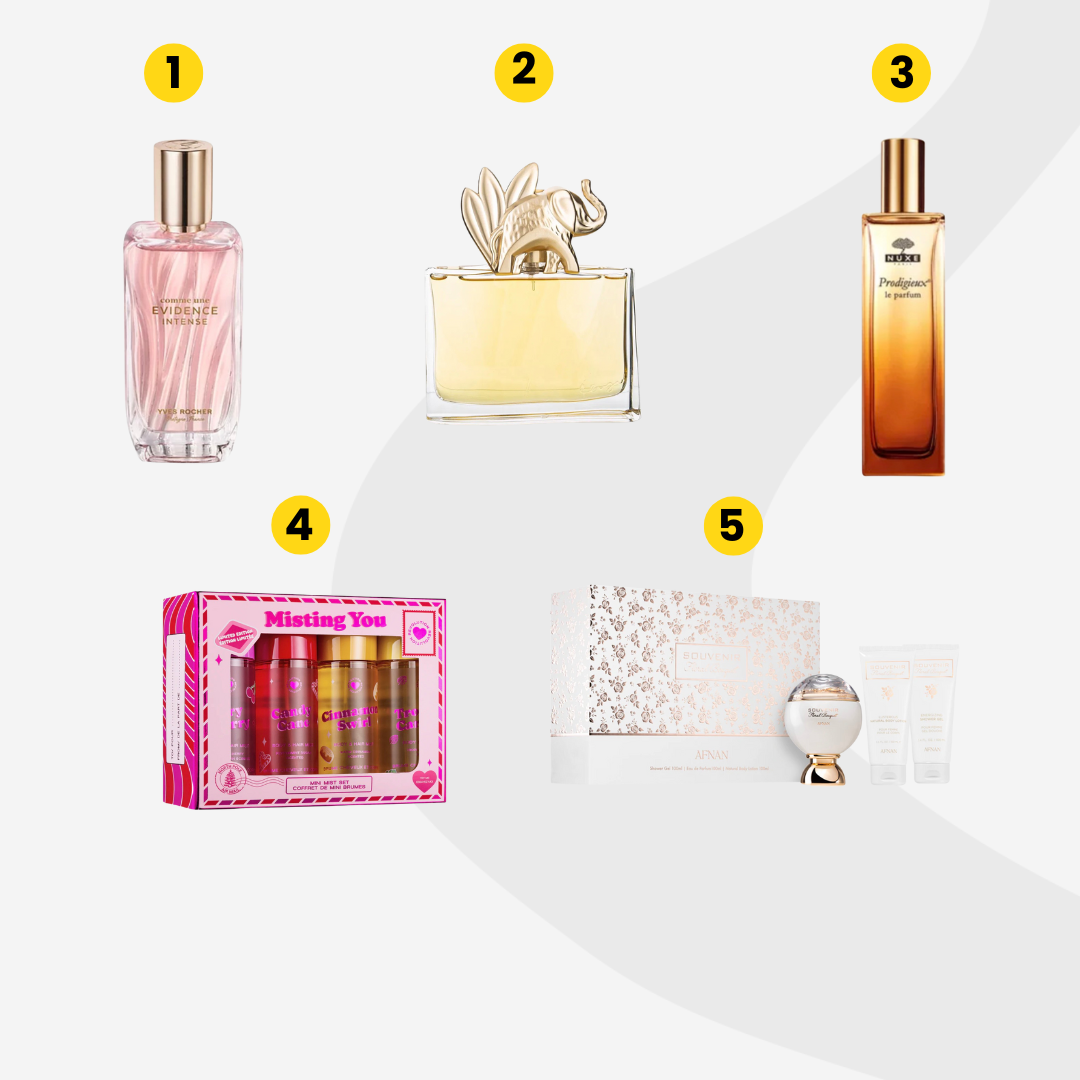 Az Afnan Souvenir Floral Bouquet ajándékszett (5) egy virágos‑elegáns illat‑szett, amely romantikus és nőies ajándék lehet karácsonyra vagy akár más ünnepre is. Az Yves Rocher Parfum (1) egy nőies, finom parfüm, ami tökéletes ünnepi ajándék lehet azoknak, akik szeretik a friss, nőies illatokat. A Nuxe Huile Prodigieuse (3) egy luxus illat‑olajos parfüm, amely finom, tartós illatot ad, olyannak kerülhet a fa alá, aki értékeli a természetes összetevőket és a kifinomult illatokat. Ha valami különlegesebbre vadászol, a Kenzo Jungle elephant (2) lehet a tökéletes: különleges, karakteres illat, ami eleganciát és egyedi stílust kölcsönöz viselőjének, ráadásul menő elefántos üvegben érkezik a fa alá. A Heart Revolution Xmas 2025 Mini Mist Set (4) pedig egy ünnepi illat‑ajándékszett mini testpermetekkel: jó választás lehet azoknak, akik szeretnek kísérletezni az illatokkal, vagy többféle illatot is kipróbálni.