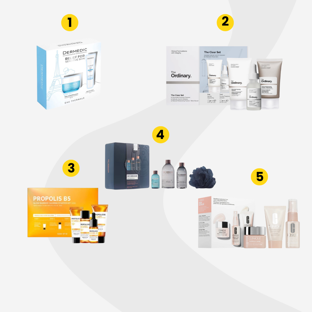 A Clinique Moisture Surge Mini Kit (4) ajándékszett egy kis kiszerelésű hidratáló arckrém‑ és ápolótermék csomag, amely segít megőrizni a bőr frissességét és nedvességtartalmát. A Clear Set ajándékszett (2) letisztult, hatékony arcápoló termékekből álló készlet, amely segíthet a bőrhibák kezelésében és a bőr ápolásában. Ha valami különlegesebbet ajándékoznál, jó választás lehet a Some By Mi Propolis B5 bőrápoló szett (3) — propolisz és B5 vitamin tartalmú termékekkel van dugig, amelyek gyengéden ápolják és vitaminokkal táplálják az arc bőrét. Ha pedig a bőr hidratálásra helyeznéd a hangsúlyt az idei karácsonykor, a Dermedic szépségápolási szettje (1) lehet a tökéletes, ez ugyanis egy hidratáló krémmel kiegészített készlet, ami segíthet a száraz bőr ápolásában és a bőr komfortérzetének javításában.
