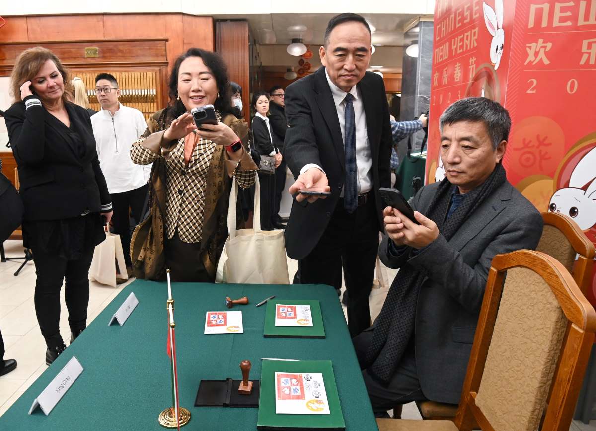 Jang Csao, a Kínai Népköztársaság magyarországi nagykövetségének ideiglenes ügyvivője kiemelte: tízéves hagyomány a kínai újév alkalmából kibocsátott bélyeg, amely a két nép közötti régi barátságról tesz tanúbizonyságot.