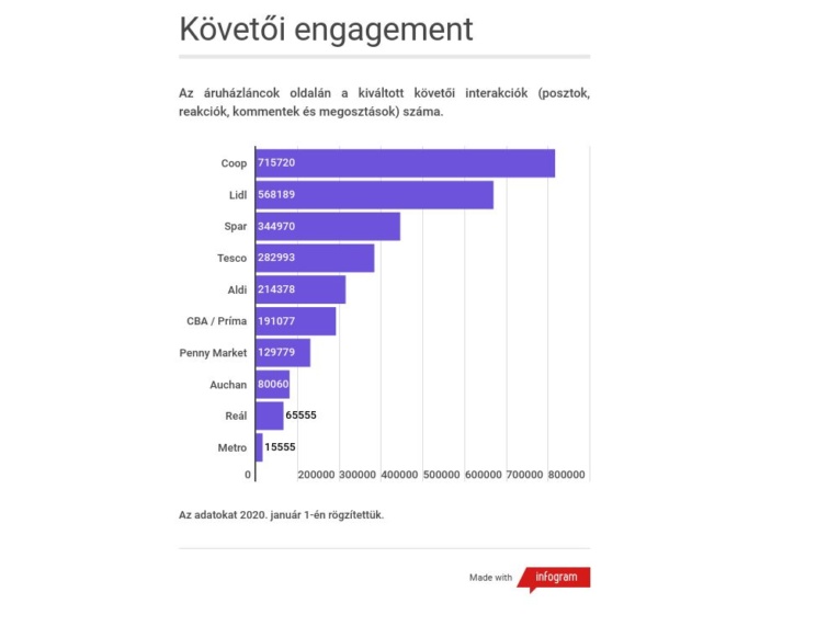“A követők magas száma azonban nem minden esetben jelenti a magas aktivitást. Meglepően a Coop követői jóval aktívabbak, mint amit az amúgy jóval népszerűbb láncok esetében rögzítettünk” – tették hozzá.
