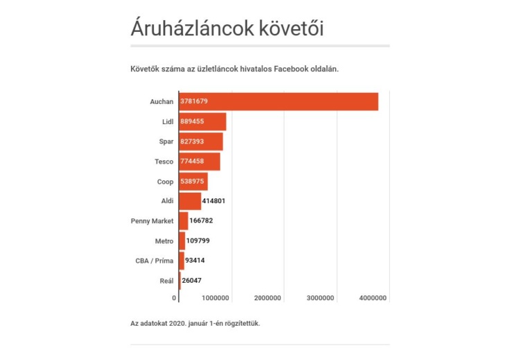 “Bár elsőre azt tapasztalhatjuk, hogy az Auchan erősen elhúz a versenytársak előtt, azonban, ha jobban megvizsgáljuk ez tulajdonképpen csak látszat. Az Auchan ugyanis az egyetlen olyan oldal, amely bár magyar nyelvű tartalmakat közöl itthon, mégis a követői bázisa nemzetközi, így azt kivételként kell kezelni. A CBA és a Príma áruházak külön oldallal rendelkeznek, de az eredeti kutatással való összehasonlítás kedvéért az adatokat összevontuk” – írják.