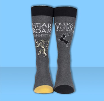Akik kedvelik a tarka zoknikat és nem kapnak agyérgörcsöt attól, ha a pár egyik fele nem olyan színű, mint a másik, azoknak jó hírünk van, már ha szeretik a Trónok harcát is. A négyes pakkokban kapható lábbeliken a Vastrónusért egymást önfeledten mészároló négy nagy ház (Stark, Lannister, Baratheon és Targaryen) címere és jelmondata található.
