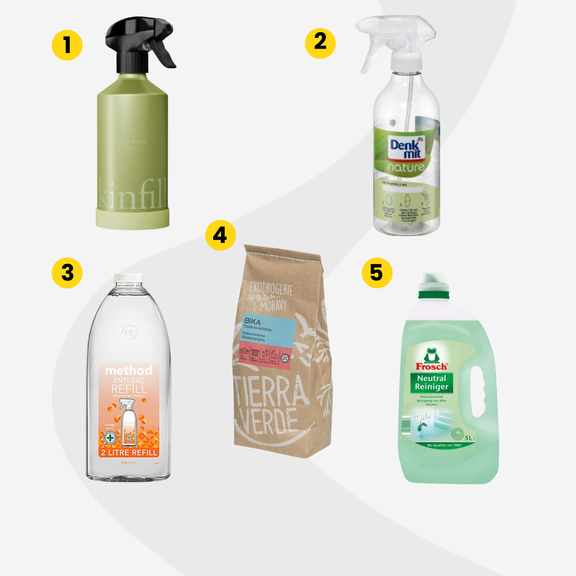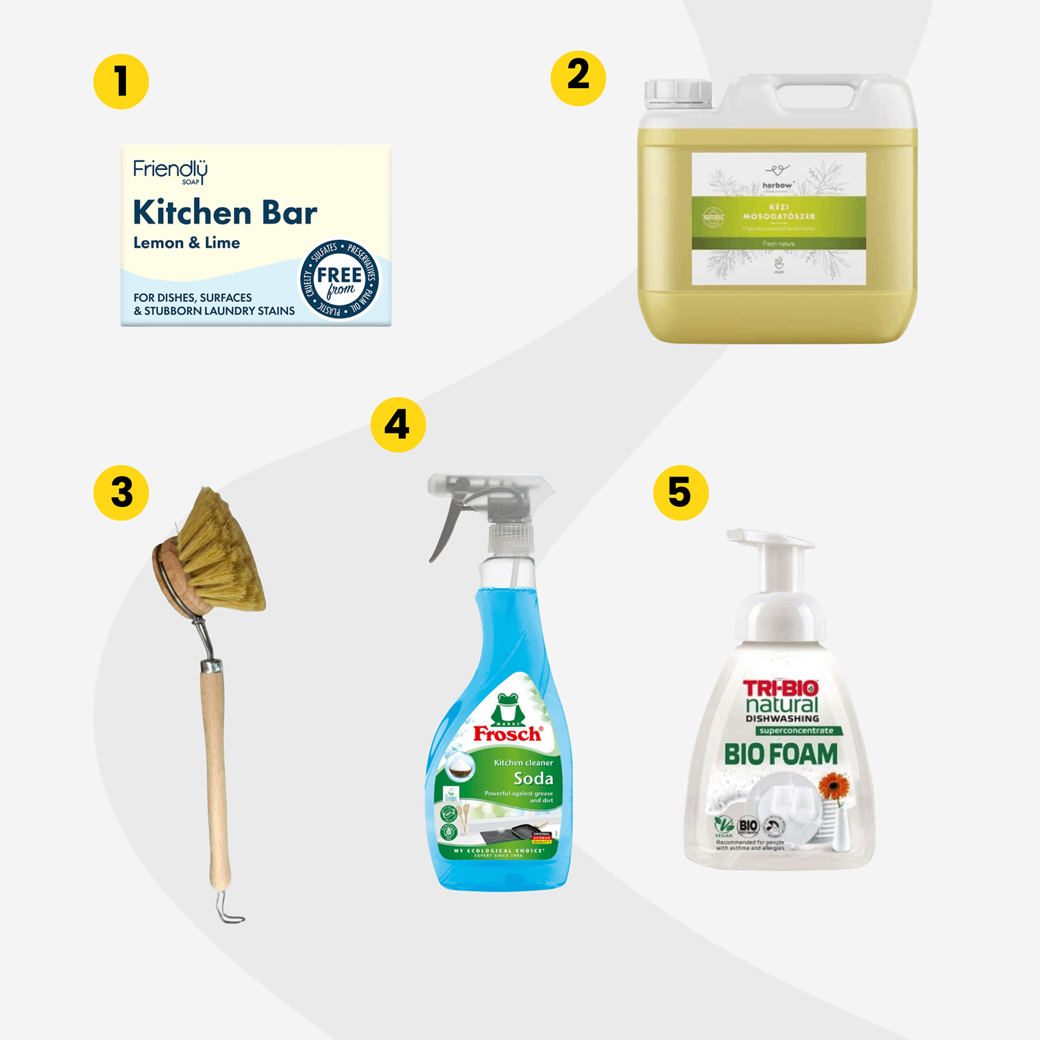 Részesítsd előnyben az újratölthető flakonokat és koncentrátumokat, használj természetes alapanyagú szereket – például ecetet, szódabikarbónát vagy mosódiót és válts műanyagmentes eszközökre, mint a fa nyelű kefe vagy a mosogatószappan. Már néhány ilyen apró váltás is jelentősen csökkentheti az ökológiai lábnyomodat.