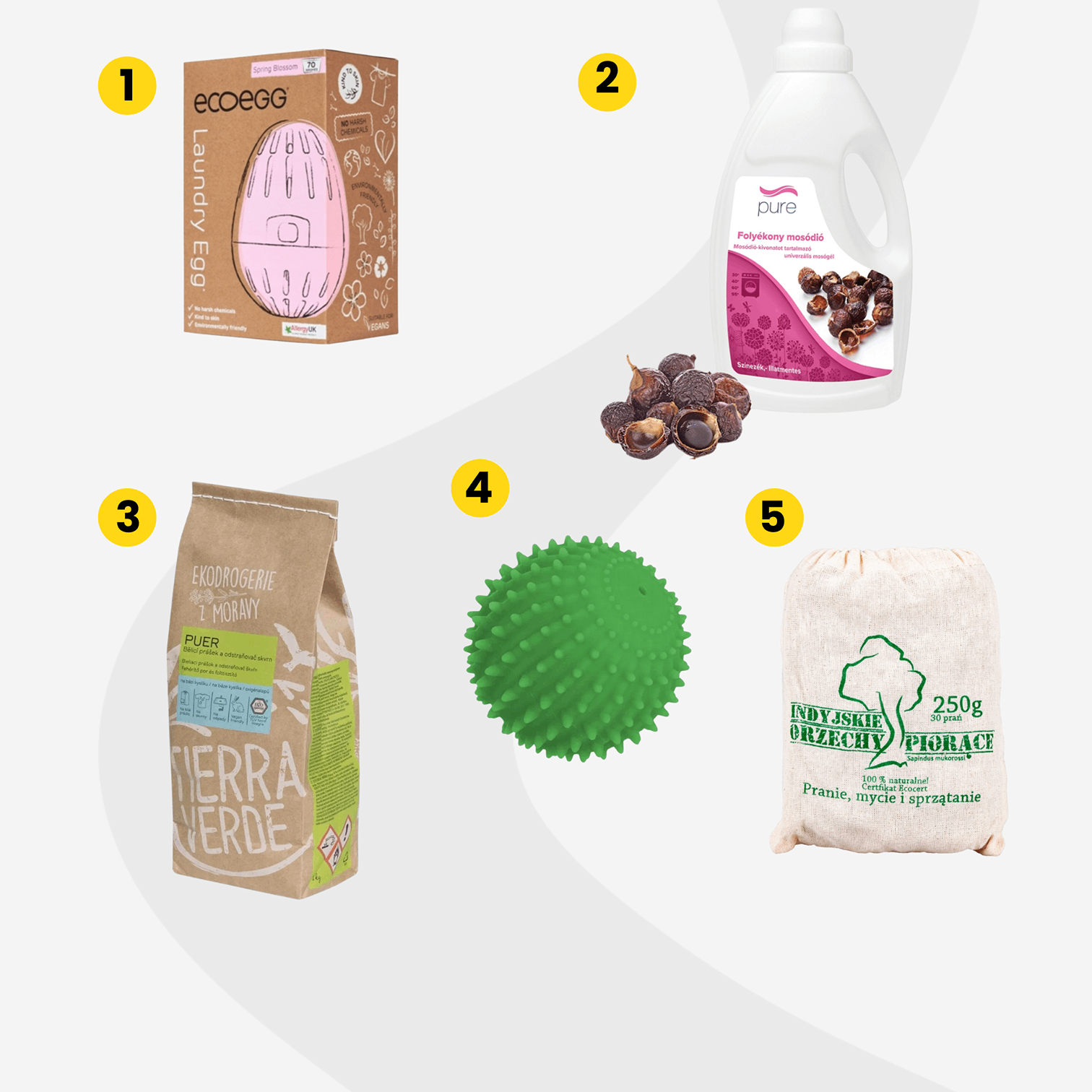 Újrahasználható, allergiamentes mosógolyók (4) a ruhák puhítására, fokozzák a mosási hatékonyságot.