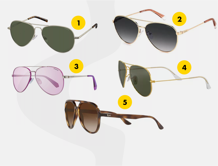 A pilóta-fazon a női napszemüvegeknél is igazi, kihagyhatatlan klasszikusnak számít. Ez a zöld lencsés, arany tónusú, fémkeretes szemüveg (1) szuperül illik majd bármilyen ruhához.