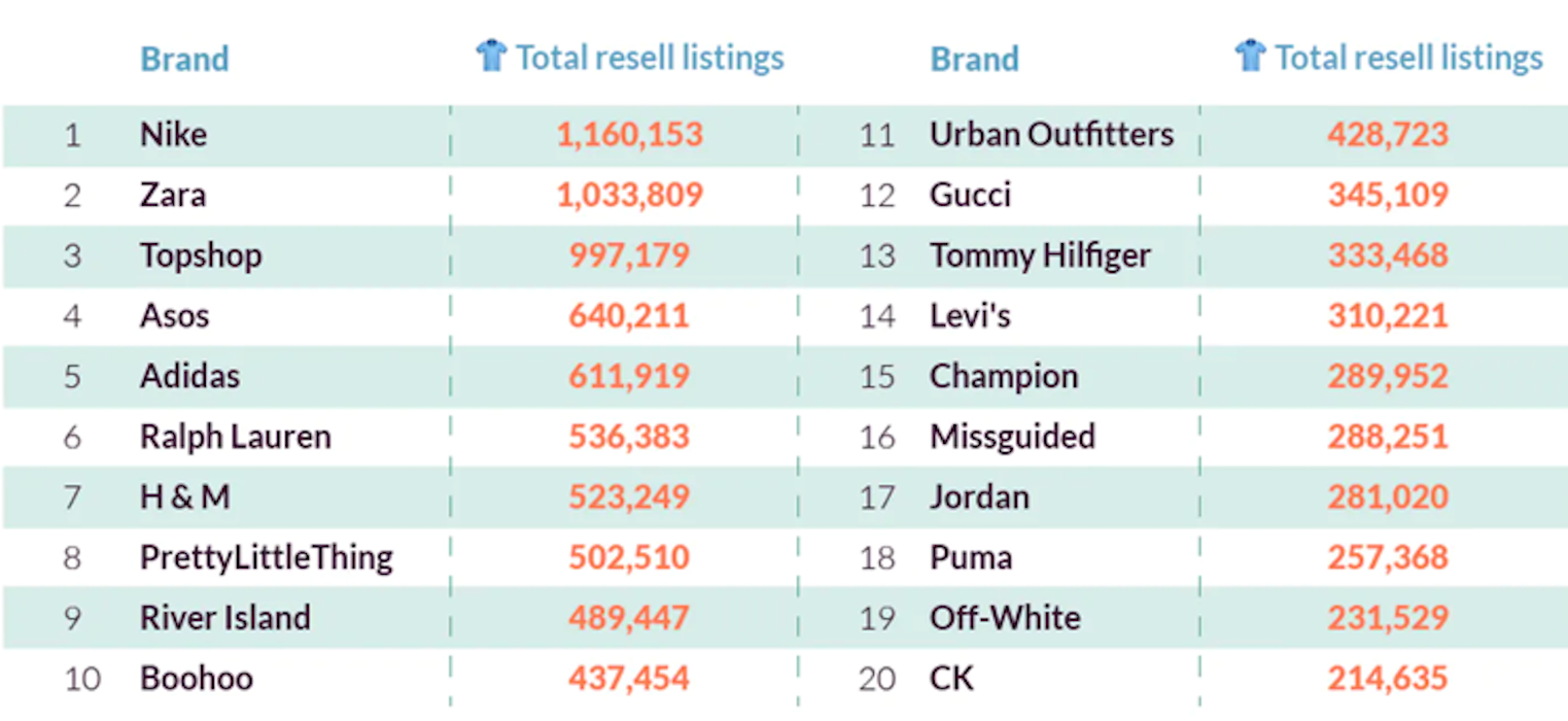Míg a fast fashion kiskereskedők hatalmas kritikával szembesülnek környezeti hatásuk miatt, mégis sokszor előkerülnek ilyen termékek az újraértékesítésben, emiatt az alapvetően rövidre kalkulált termékeik élettartama megnő. Például a PrettyLittleThing a világ egyik legtöbbet eladott márkájaként szerepelt, ahogy a Boohoo és a Missguided is, mindkettő a kutatás szerint a világ 20 legtöbbet újra eladott divatmárkája közé került.