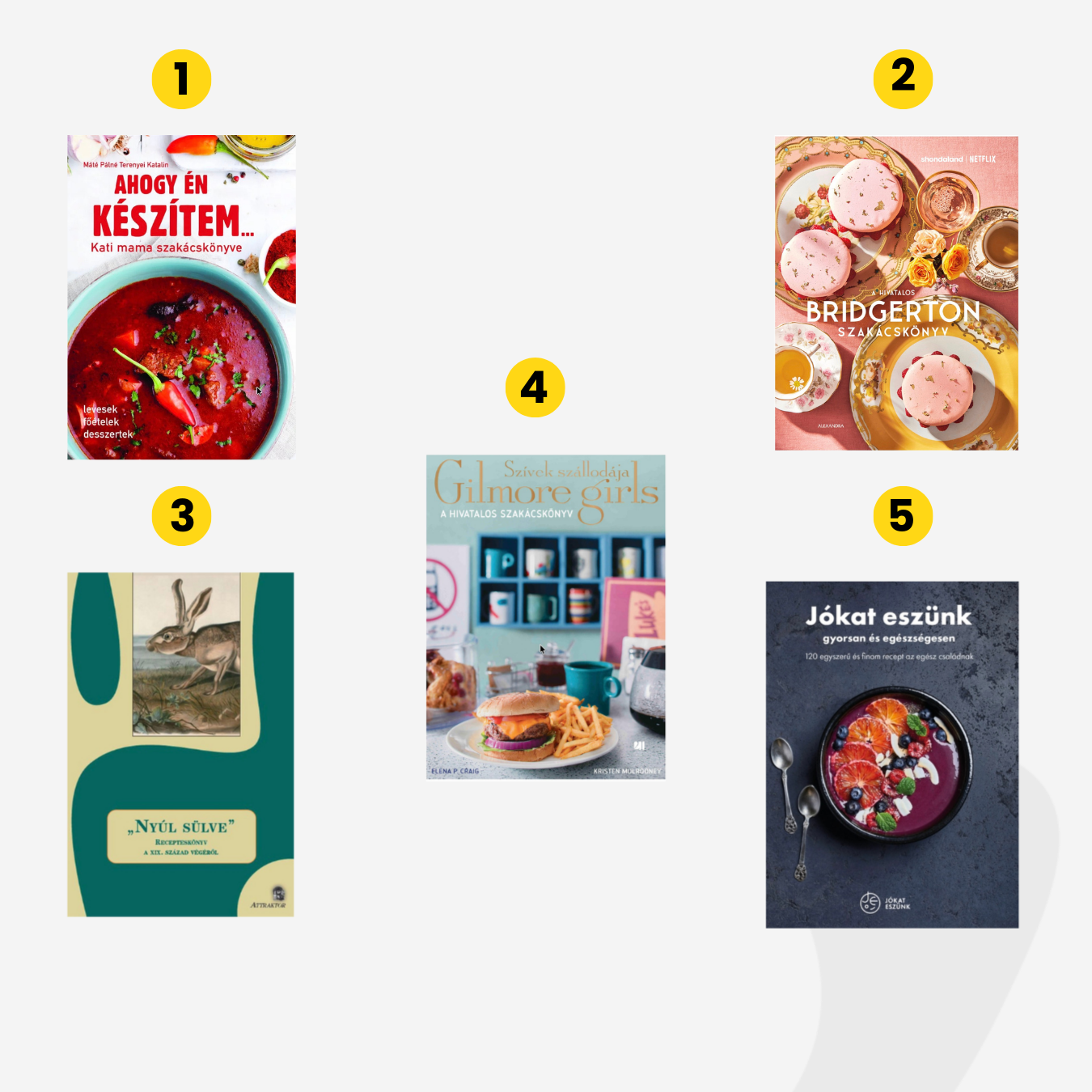 A Szívek szállodája: A hivatalos szakácskönyv (4) egy Gilmore Girls ihletésű receptgyűjtemény ikonikus sorozatbeli fogásokat hoz el Luke hamburgereitől Sookie különlegességeiig. A hivatalos Bridgerton-szakácskönyv (2) elegáns, régens kori hangulatú lakomákat varázsol az asztalunkra. A Nyúl sülve (3) a nyúlhús változatos elkészítési módjait mutatja be a hagyományostól a modernebb fogásokig. Az Ahogy én készítem (1) személyes hangvételű, bevált receptekkel dolgozó kötet. A Jókat eszünk gyorsan és egészségesen (5) pedig 120 egyszerű, családbarát ételt kínál azoknak, akik gyorsan szeretnének finomat és táplálót főzni.