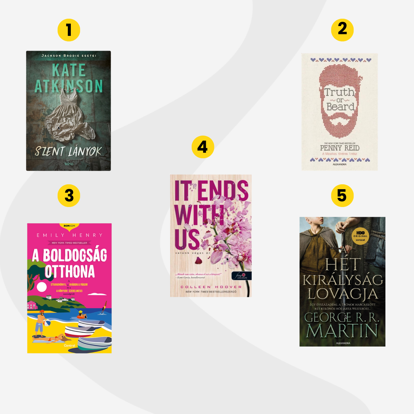 A boldogság otthonában (3) Emily Henry könnyed, tengerparti hangulatú romantikus történetében két ex kénytelen eljátszani a boldog párt egy baráti nyaraláson, miközben régi érzéseik újra felszínre törnek. A Szent lányok (1) Kate Atkinson izgalmas, intelligens krimije, amely több szálon futó rejtélyt és mélyen kidolgozott karaktereket kínál. A Velünk véget ér (4) Colleen Hoovertől egy érzelmileg erőteljes romantikus regény a szenvedély, a múlt árnyai és a nehéz döntések témáiról. A Truth or Beard (2) Penny Reid humoros, kisvárosi romkom sztorija ikrekkel és félreértésekkel fűszerezve. A hét királyság lovagja (5) George R. R. Martintól pedig egy Trónok harca világában játszódó kalandos fantasy, lovagi becsületről és hősi próbatételekről mesél.