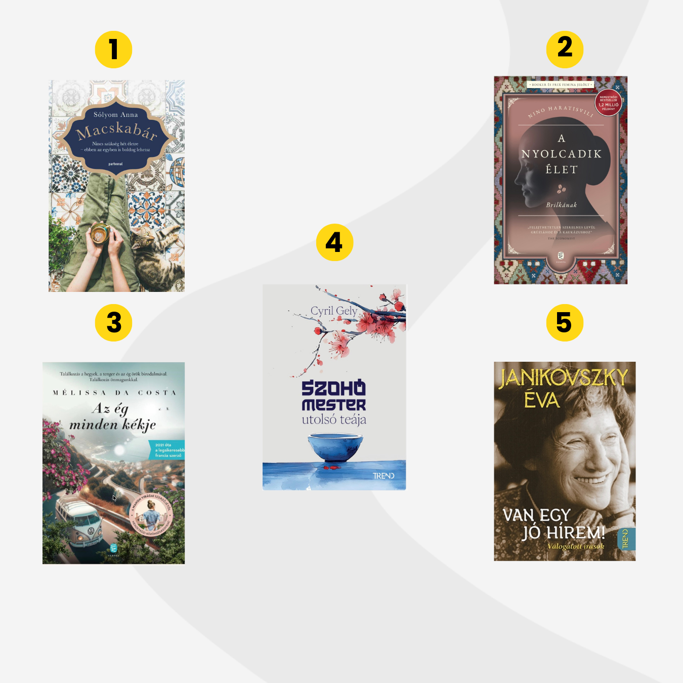 A Szóho mester utolsó teája (4) finoman filozofikus történet az élet apró pillanatainak jelentőségéről. A Van egy jó hírem (5) válogatott írások esszéket és rövidebb prózákat gyűjt egybe Janikovszky Évától, érzékenyen reflektálva a hétköznapokra. Az ég minden kékje (3) Mélissa Da Costa megható utazástörténete betegségről, szerelemről és az élet utolsó nagy kalandjáról. A Macskabár -Nincs szükség hét életre (1) könnyedebb hangvételben mesél boldogságról és újrakezdésről. A nyolcadik élet (2) Nino Haratischwili monumentális családregénye, amely generációkon átívelve mutatja be Kelet-Európa viharos történelmét.