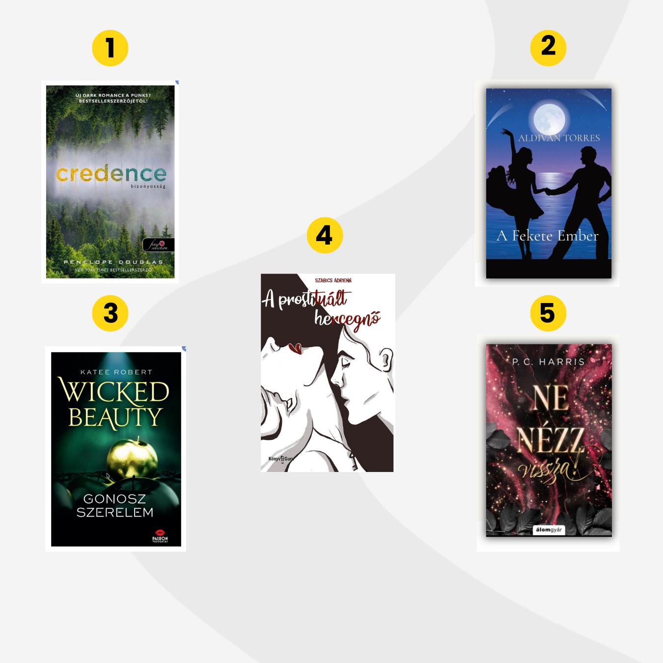 A Fekete ember (2) Richard K. Morgan kemény hangulatú sci-fi/noir műve, amely identitásról és társadalmi kirekesztésről szól. A Bizonyosság (1) Penelope Douglas provokatív, érzelmileg intenzív romantikus története tiltott vágyakkal. A Ne nézz vissza (5) egy feszült, titkokkal teli thriller, amely fokozatosan tárja fel múlt és jelen veszélyes összefonódását. A Wicked Beauty, Gonosz szerelem (3) Katee Robert modern, mitológiai ihletésű, szenvedéllyel teli romantikus fantasy regénye. A prostituált hercegnő (4) merész, társadalmi határokat feszegető történet szerelemről és túlélésről.