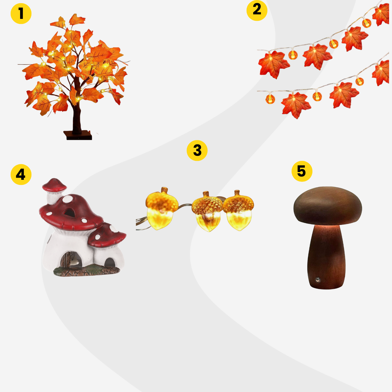 Ősszel a korán sötétedő napok különösen kívánják a hangulatfényt. Egy levél formájú égősor (2) vagy a makkos fényfüzér (3) finom melegséget áraszt, akár a nappaliban, akár a teraszon használjuk. Ha valami játékosabbat keresünk, a világító gombaház (4) vagy a kis őszi fa lámpácska (1) varázslatos hangulatot kölcsönöz az esti pihenéshez. A modern stílus kedvelői pedig egy elegáns gomba asztali lámpával (5) tehetik teljessé a fényjátékot.
