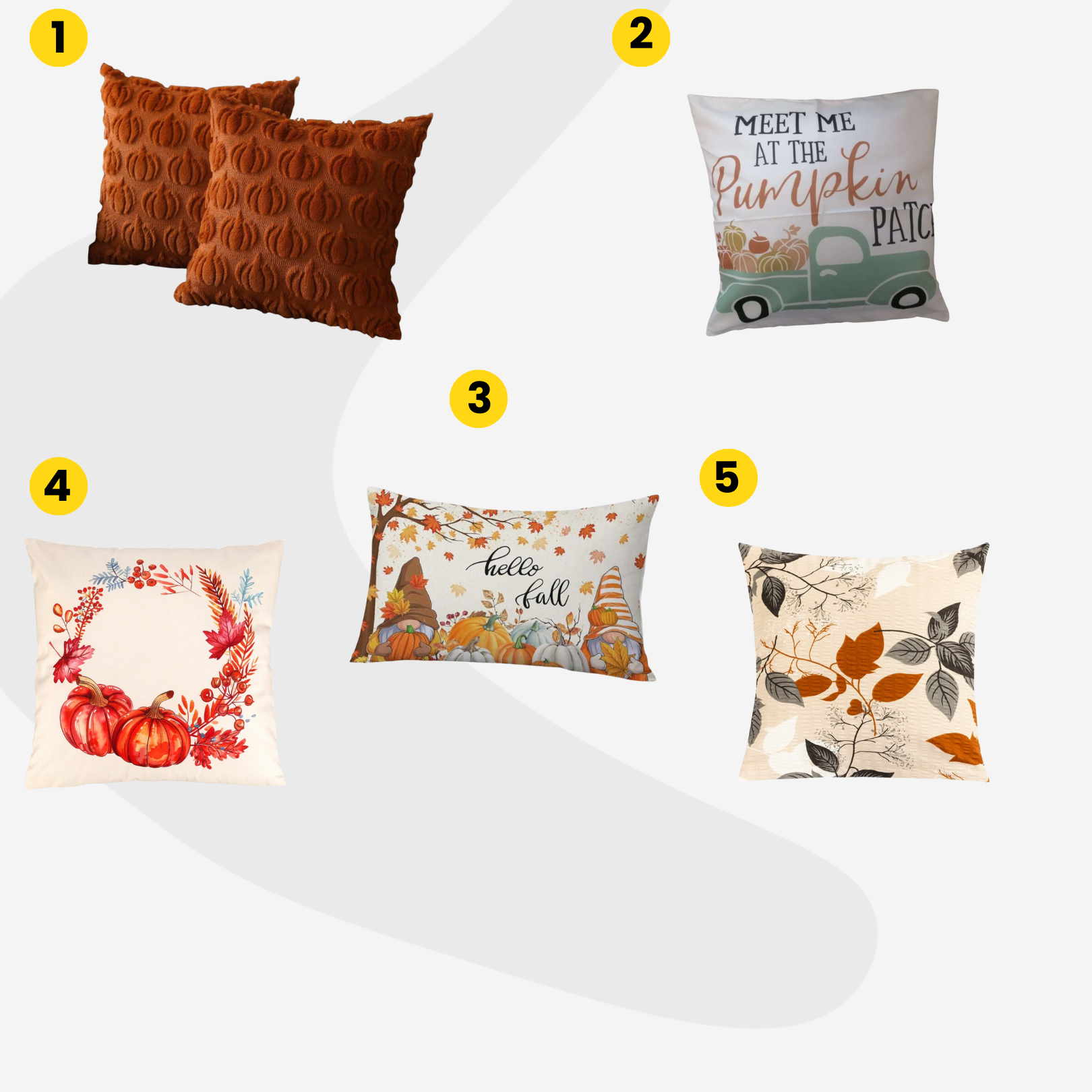 A kuckózós hangulatot a puha textíliák teszik teljessé. A tök mintás párnahuzat (4) , a Pepita tökszállító furgonos huzata (2), vagy a bársonyos, rozsdaszínű sütőtökös párna (1) szinte hívogat, hogy lehuppanjunk a kanapéra. Akik már unják a tök motívumot, azoknak az őszi leveles huzat (5) hozza meg a szezon színeit a nappaliba. A bőséges választékot egy kedves üzenettel díszített, több darabos „Hello Autumn” huzatszett (3) koronázza meg, amely kültéren és beltéren egyaránt használható.