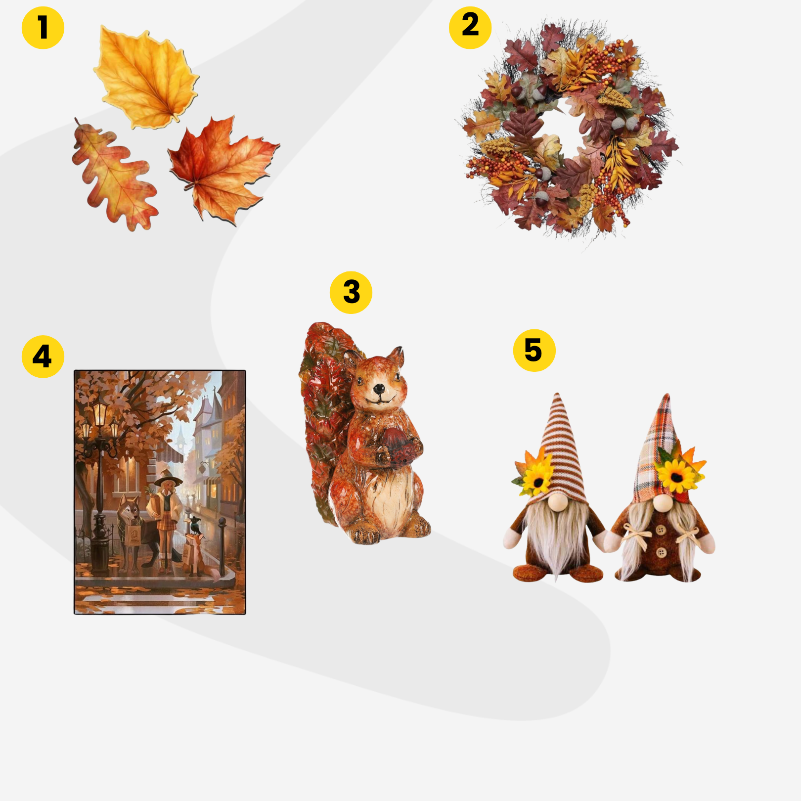 Az apróbb kiegészítők segítenek leggyorsabban megteremteni az őszi atmoszférát. Egy bájos őszi törpe (5) az asztalon vagy polcon rögtön barátságosabbá varázsolja a szobát, míg az ajtóra akasztott őszi koszorú (2) mesterséges juharlevelekkel és bogyókkal azonnal az évszak hangulatát idézi meg. Ha a falakat szeretnénk feldobni, ez a cuki őszi tájképes poszter szett(4) már ránézésre is melegséget sugároz. A játékos részletek kedvelőinek pedig egy kerámia mókus dióval (3) garantáltan szívmelengető látványt nyújt, míg a lézervágott falevelek (1) bármelyik helyiségben jól mutatnak.