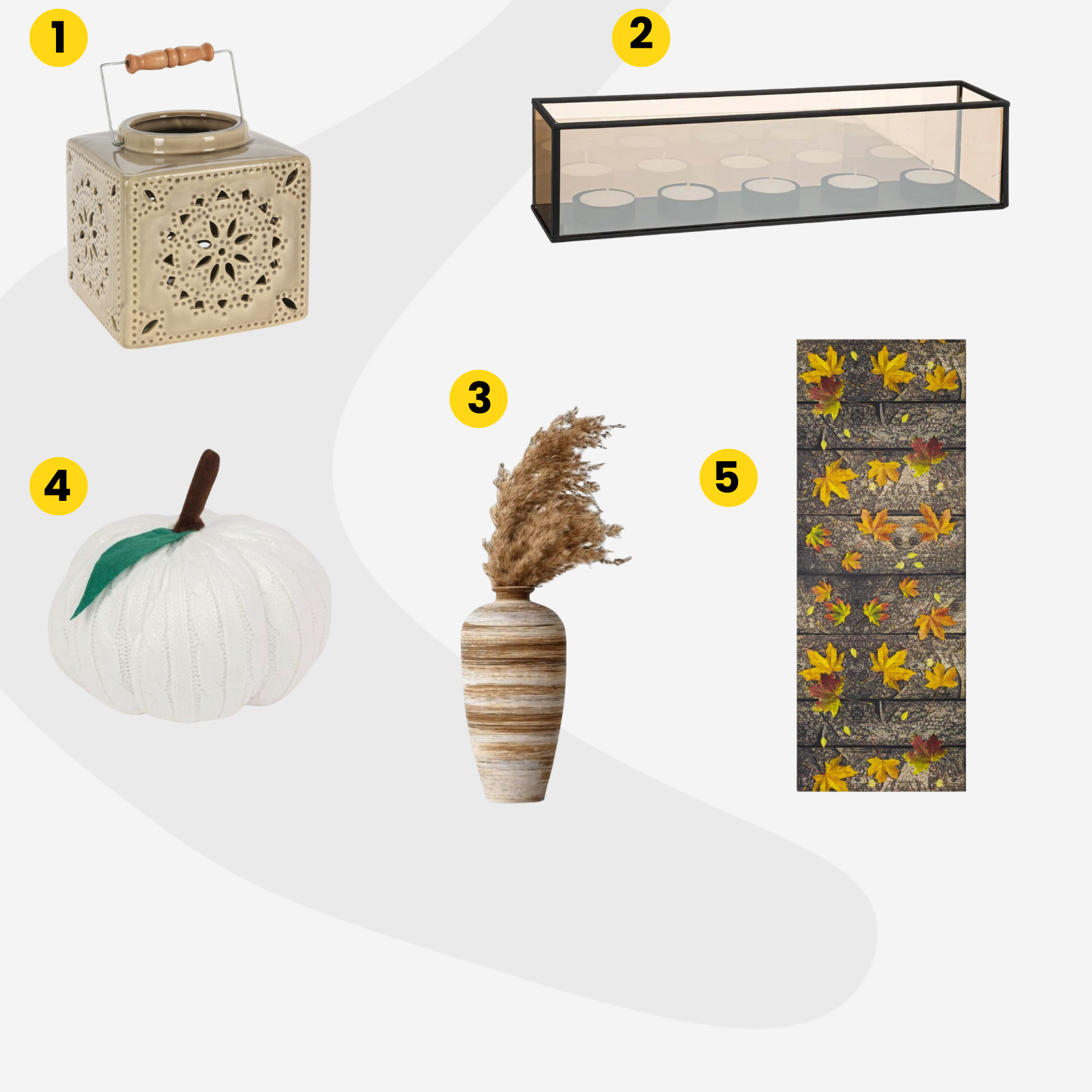 A hangulatteremtés nem ér véget a falakon és asztalokon: a padlón elhelyezett dekorációk ugyanilyen fontosak. A levél mintás őszi futószőnyeg (5) melegebbé és otthonosabbá varázsolja a folyosót vagy a nappalit, míg a puha fehér kötött tök (4) trendi és játékos kiegészítő. A fényekről sem kell lemondani – a kerámia gyertyatartó (1) perforált mintáival gyönyörű árnyékokat vetít a falra, a rusztikus kerámiaváza (3) szárított virágokkal pedig vidéki hangulatot csempész a lakásba. Az egyszerű, mégis elegáns kiegészítők hívei számára pedig az üveg gyertyatartó (2) tökéletes választás.