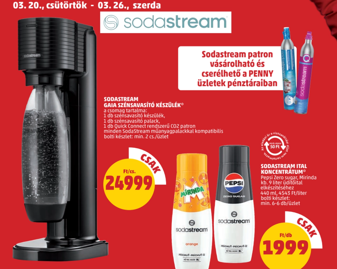 A Penny akciós újságából kiderül, hogy a boltlánc március 20., csütörtöktől árulja verhetetlen áron, 24 999 forintért a Sodastream Gaia szénsavasító készüléket – az eredeti ár a hivatalos honlap szerint 29 990 forint. A csomag tartalma maga a szénsavasító készülék, egy darab szénsavasító palack, egy darab Qiuck Connect (gyors csatlakozós) rendszerű CO₂ patron élelmiszergázzal, ami