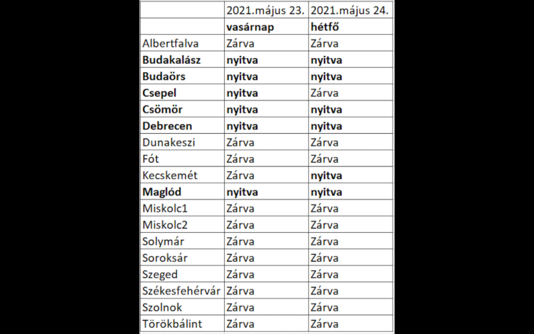 Időközben az Auchan oldalán is megjelent a tájékoztatás, miszerint május 23-án és 24-én, vasárnap és hétfőn az áruházaik egységesen zárva tartanak, május 22-én és 25-én a rendes nyitvatartás szerint várják a vásárlókat. Május 23-án és 24-én online áruház kiszállítása is szünetel, de a feladott rendeléseket módosítani természetesen ezen a napon is lehetséges. A töltőállomások kapcsán közölték: az automata kútoszlopaikon az ünnepi hétvégén is egész nap, 0-24 órában lehetséges a tankolás.