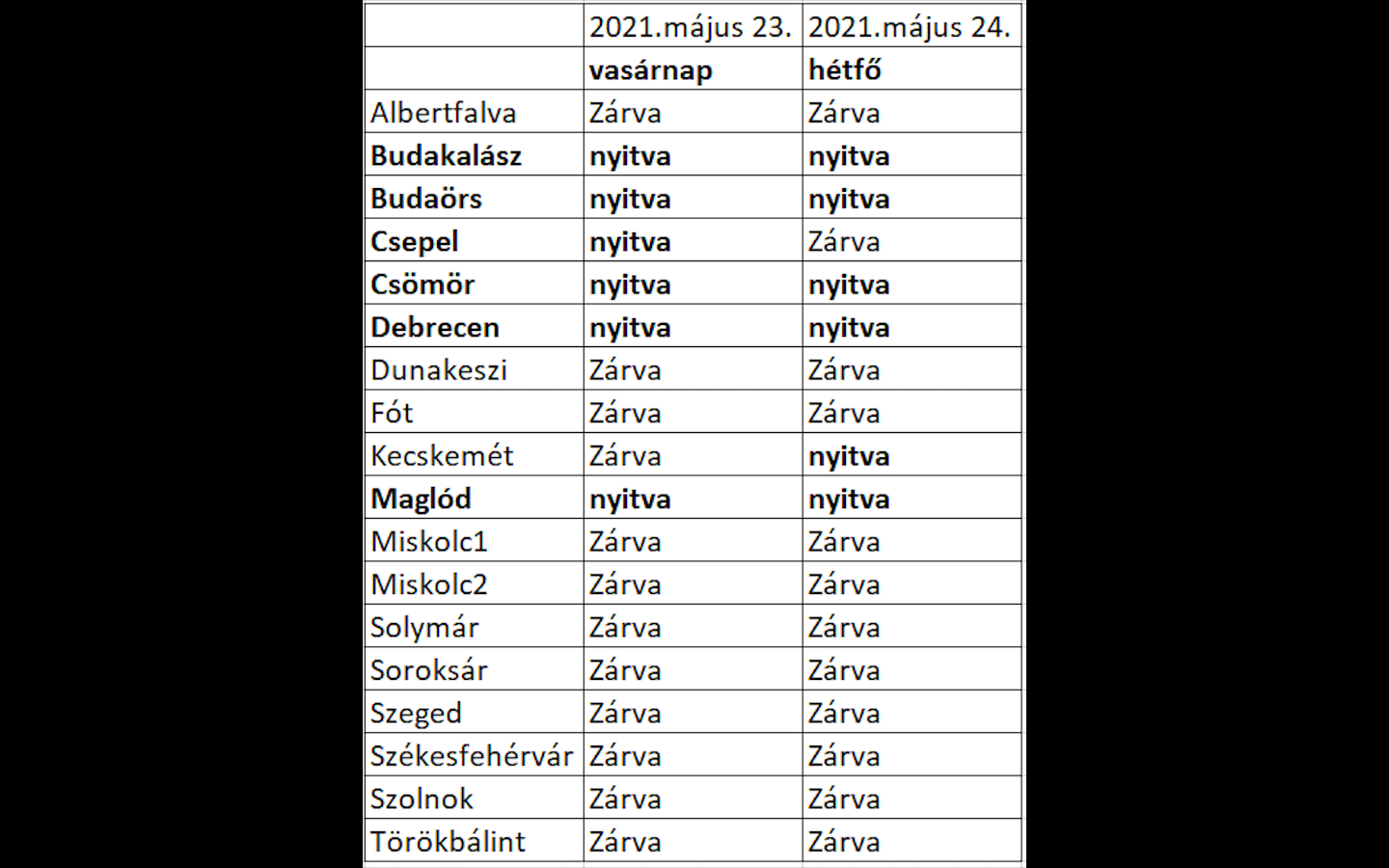 Időközben az Auchan oldalán is megjelent a tájékoztatás, miszerint május 23-án és 24-én, vasárnap és hétfőn az áruházaik egységesen zárva tartanak, május 22-én és 25-én a rendes nyitvatartás szerint várják a vásárlókat. Május 23-án és 24-én online áruház kiszállítása is szünetel, de a feladott rendeléseket módosítani természetesen ezen a napon is lehetséges. A töltőállomások kapcsán közölték: az automata kútoszlopaikon az ünnepi hétvégén is egész nap, 0-24 órában lehetséges a tankolás.
