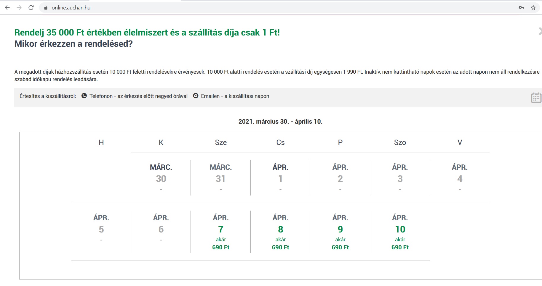 Az Auchannál is igénybe lehet venni a házhoz szállítást és az átvételt – ez utóbbit Soroksáron, Újhegyen, Törökbálinton, Budakalászon és Szigetszentmiklóson. Ami a házhoz szállítást illeti, irányítószámtól függetlenül igencsak elfogytak a hétre az elérhető időpontok – még a jövő hét elejére is.