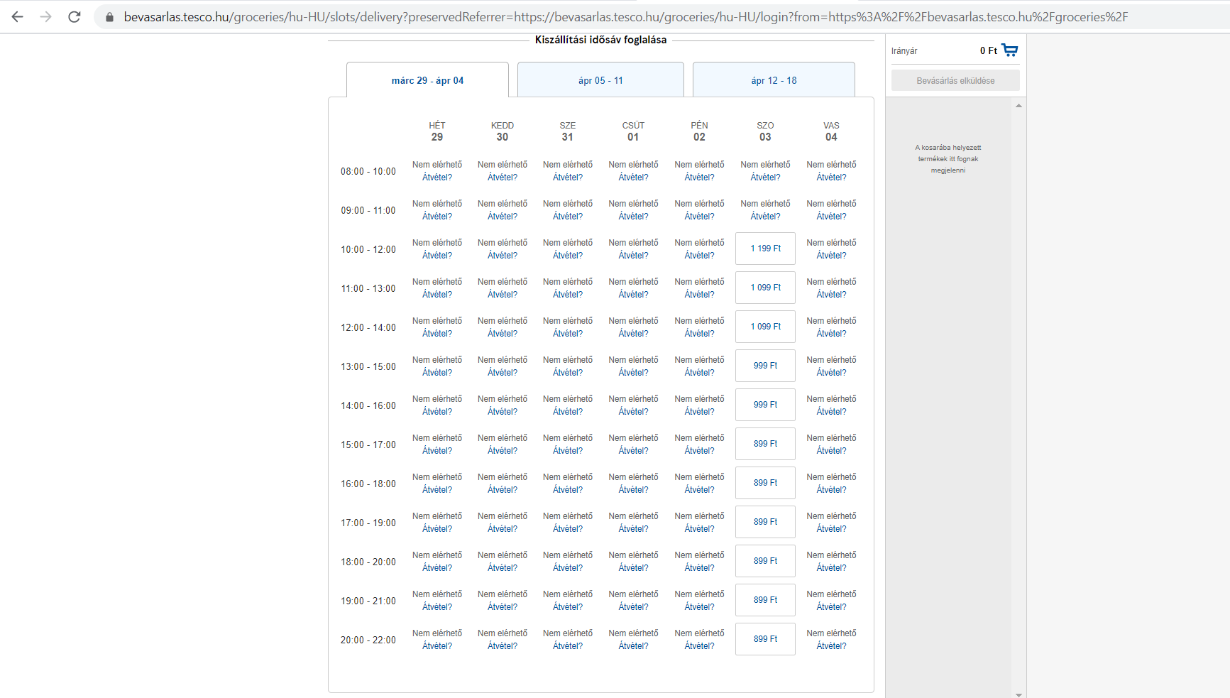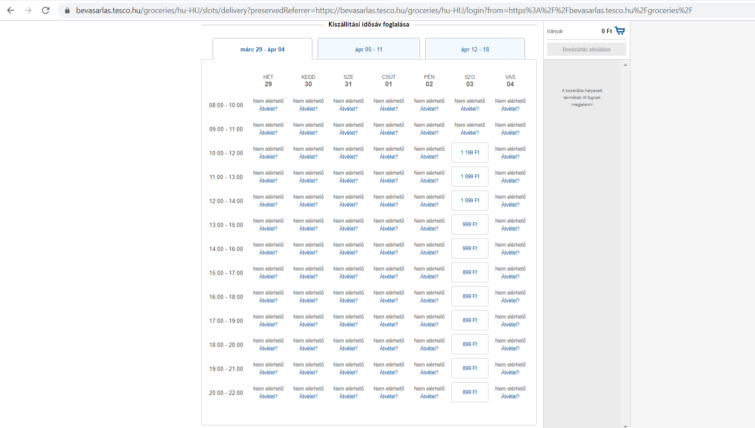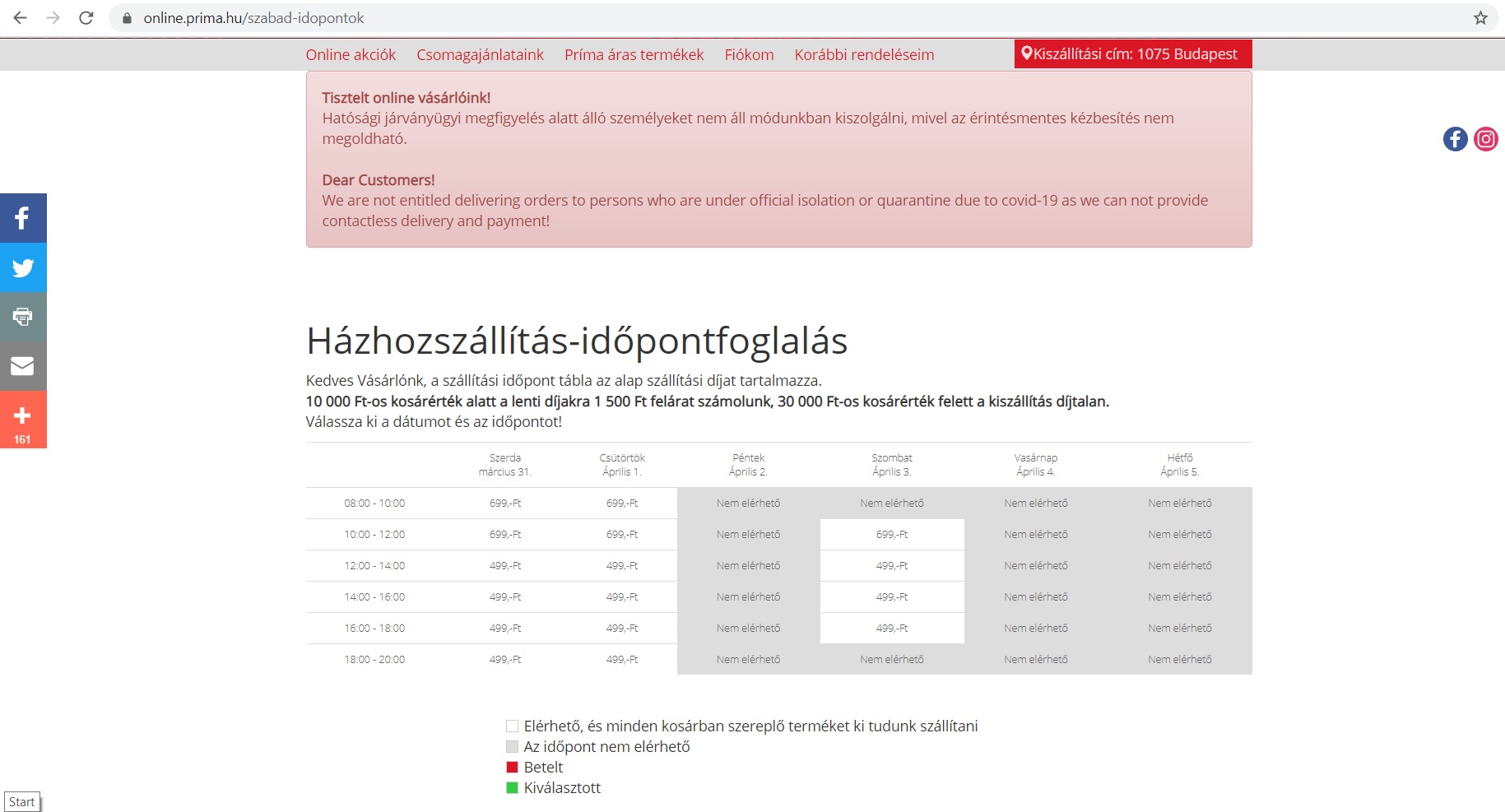 A házhoz szállítás esetében is egyre fogynak a szabad időpontok, 03.29-04.04. közötti időszakban azért még ki lehet fogni egyet-kettőt – főként a Nagypéntek után, szombatra, előtte nem igazán – a következő hétre azonban bőségesen akad szabad idősáv.