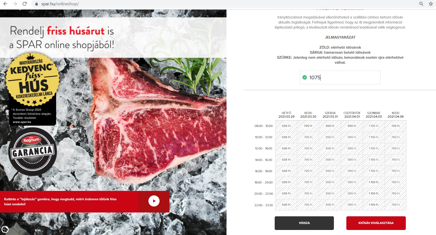 Elsőként a Spar szolgáltatásait néztük meg: a házhoz szállításnál egyetlen elérhető időpont sincs 03.29-től 04.06-ig terjedő időszakra, pedig több irányítószámmal is próbáltuk.