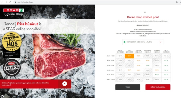 Több átvételi pontos van – például a Váci úti, Bécsi úti, budaörsi, csepeli és pesterzsébeti. Budaörsön, Pesterzsébeten és a Váci úton nem akad már a hétre szabad idősáv, a Bécsi úton csak hét végére, Csepelen viszont bőséges választék közül szemezgethetnek a rendelni vágyók – következő hétre persze mindenhol sok a szabad időpont. Arról is tájékoztatják a vásárlókat, hogy 2021. március 3-tól visszavonásig az Átvételi Pontokon való rendelés átvétel csak 19 óráig lehetséges. Minden esetben preferálják az online fizetést, és kérik a maszk használatát.