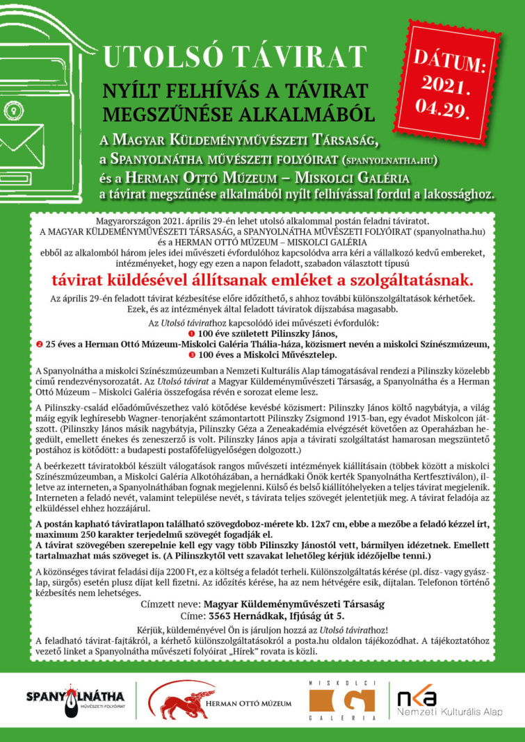 A Spanyolnátha a miskolci Színészmúzeumban a Nemzeti Kulturális Alap támogatásával rendezi a Pilinszky közelebb című rendezvénysorozatát. Az Utolsó távirat a Magyar Küldeményművészeti Társaság, a Spanyolnátha és a Herman Ottó Múzeum – Miskolci Galéria összefogása révén e sorozat eleme lesz.